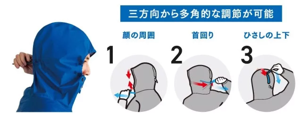 フードは、三方向から多角的に調節可能なため高いフィット感が得られ、良好な視界を確保できます。スタッフバッグ付きで、コンパクトに収納できるのも魅力です。