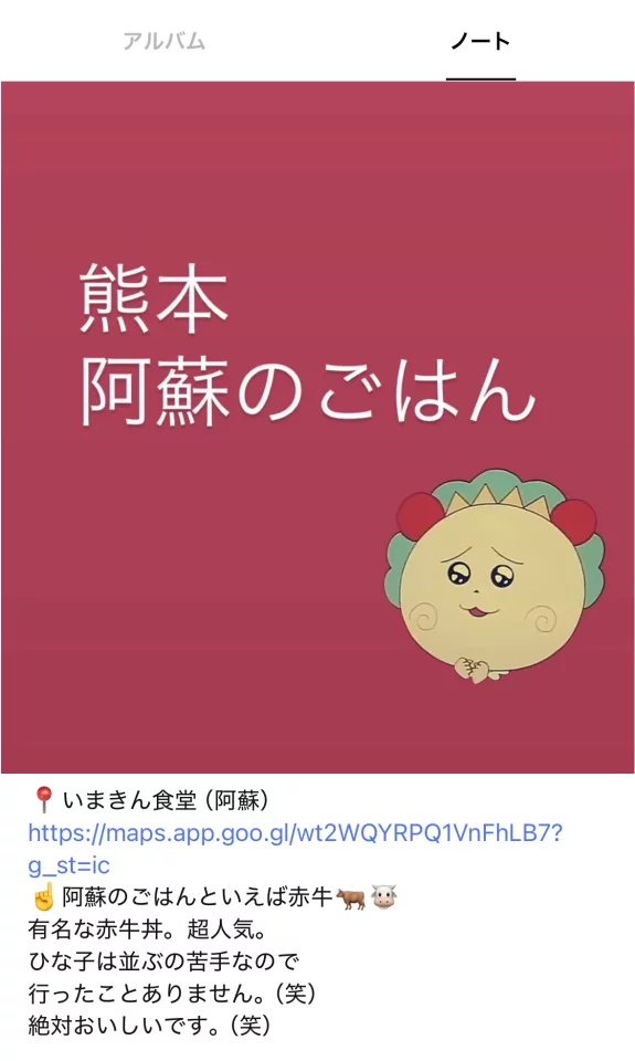 私たちがくじゅうへ飛び立つのは5月末の土日になった。ここの日程を覚えていてくれているのが流石のひなこちゃん。仕事中にやけにスマホが鳴るなと思ったらジュンと3人のラインが立ち上げられ、ひなこちゃんのおすすめの熊本・くじゅう・阿蘇エリアのスポットが説明文付きでまとめられていた。やってることめちゃくちゃ可愛いじゃん。