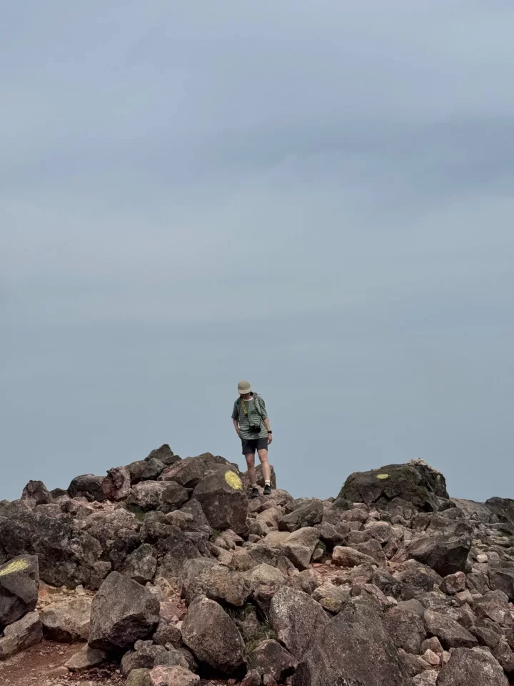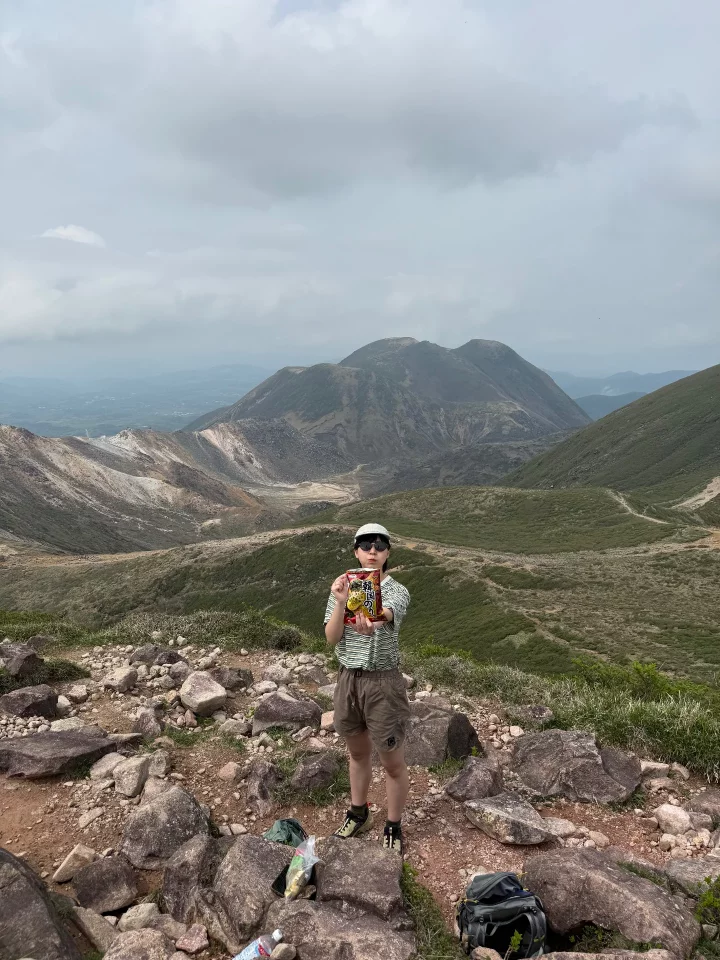 そして何より驚いたのは、少し歩いたらもうとんでもない異世界に入り込めてしまうこのくじゅう連山のスケールである。安達太良山のような火山の雰囲気と、平標山のような平らな緑の斜面と、天狗岳みたいな緩やかな岩の登りと。こういう景色って、普通頑張って山奥まで車を走らせたり、頑張って山深くまで歩いて来ないと見られないんだよな。まあ確かに登山口の時点で山奥まで来ているのだけど、ほんと体感的にはこんなにサクッと街ではない場所に来られるなら、そりゃ九州の人たちは山が好きになるなと思った。どこまでも平らでどこまでも山が続いている。いろんなコースがあると習ったが、確かにそのいろんなコースを歩きたくなると思った。今日はそのほんの一部しか歩かない私たちだけど、このくじゅうの山の入り口に立ててその奥行きを押し測ることができる経験ができたんだってことはとても嬉しい。