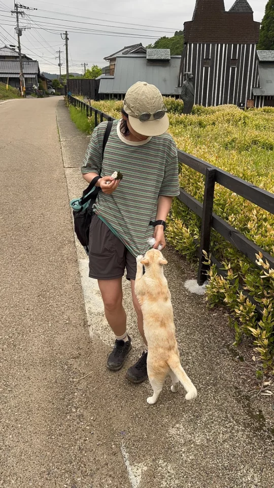 温泉に着いたら、入り口で猫が2匹たむろしていて、なかなか退いてくれなかった。後続車もいないので「もぉ〜♡邪魔だよぉ〜♡どいてよ〜♡」と女2人ヘラヘラしながら猫を眺める。車から降りた後も全く逃げない猫たちに、猫好きのジュンは大興奮していた。とても人懐っこく、ジュンの食べてるおにぎりをよこせと擦り寄ってくる白猫ちゃん。旅先で見た猫史上、いちばんかわいい。