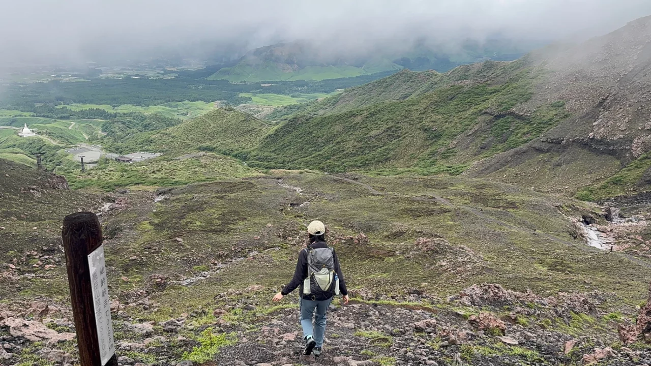 阿蘇までの道は、ここまで見てきた九州の景色からするとメチャクチャに栄えていた。コンビニが5件くらいあってびっくり。そしてそんな街並みを横目に山道へ入っていくが、街から5分でここに着くの?って思う壮大な景色にまたもびっくり。これが家の裏にある人生ってどんな世界線なんだよ。
