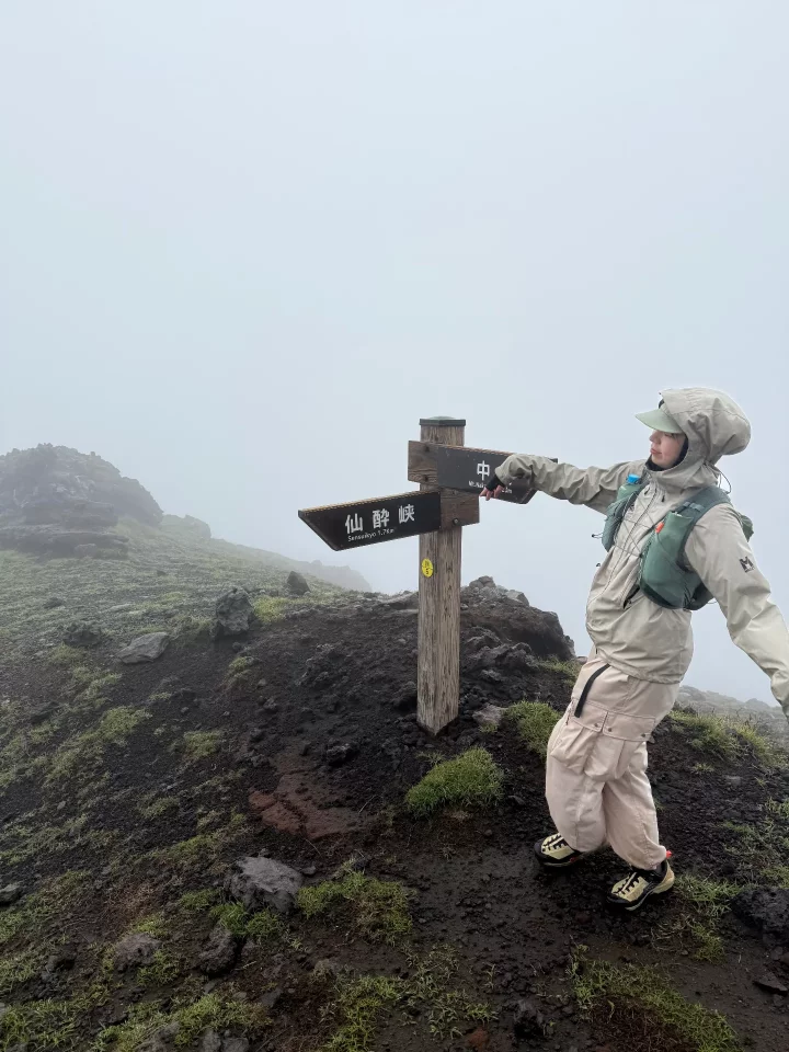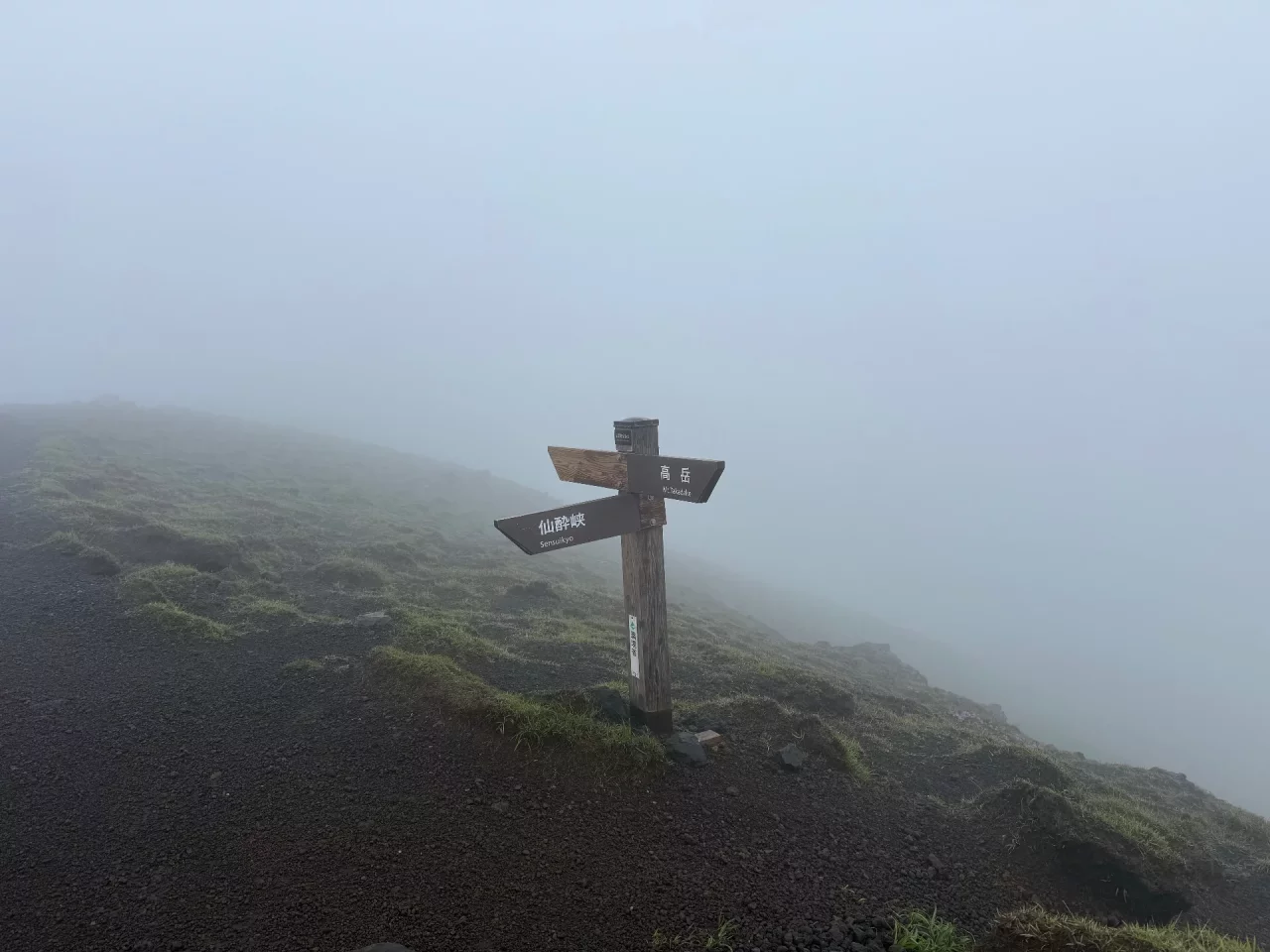 とはいえ登っている時はそんな具合にローテンションながらもご機嫌だったんだけど、高岳への分岐通過した後の稜線(なのか?何も見えなさすぎてよくわからない)は久々に悪天候すぎて面白くなってしまった。霧雨みたいなのも降り出したからレインを着てフードも被る。フードの余った布で風が遊んでバタバタバタと激しく顔を打ちつける。なんかもうおかしくて声出して笑っちゃった。何がおかしかったのかというとうまくいえないんだけど、多分色々まとめると「休みの日に九州来て早起きしてこんな思いしてる人生ってなんなんだろう」って言うおかしさなんじゃないかと思いました。