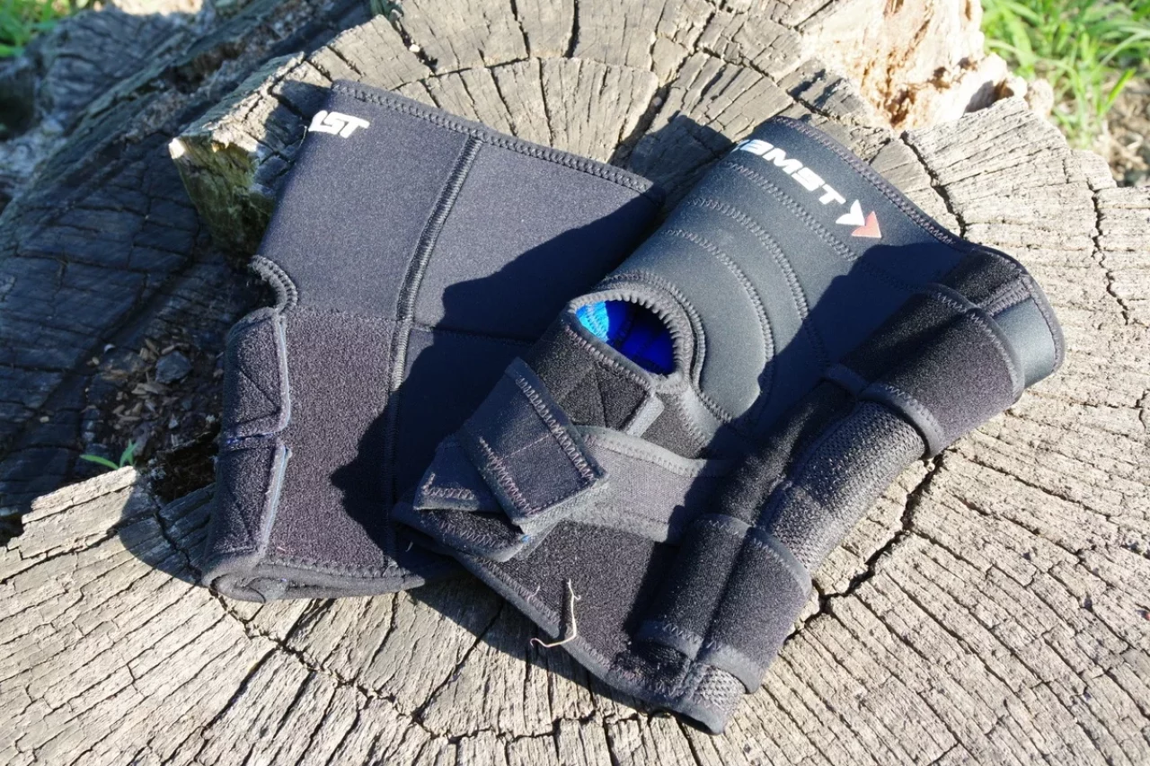 膝サポーターには、オープンタイプとクローズドタイプの2種類があります。クローズドタイプ(写真下:ZAMST ZK-PROTECT)は膝全体を包み込む構造で、固定力と保温性に優れます。膝に強い不安がある人や術後のサポートとして選ばれますが、厚みや動きの制限、蒸れやすさが課題となるため、登山ではやや限定的な用途。登山では軽くて蒸れにくく、行動中でも着脱しやすいオープンタイプが良いでしょう。