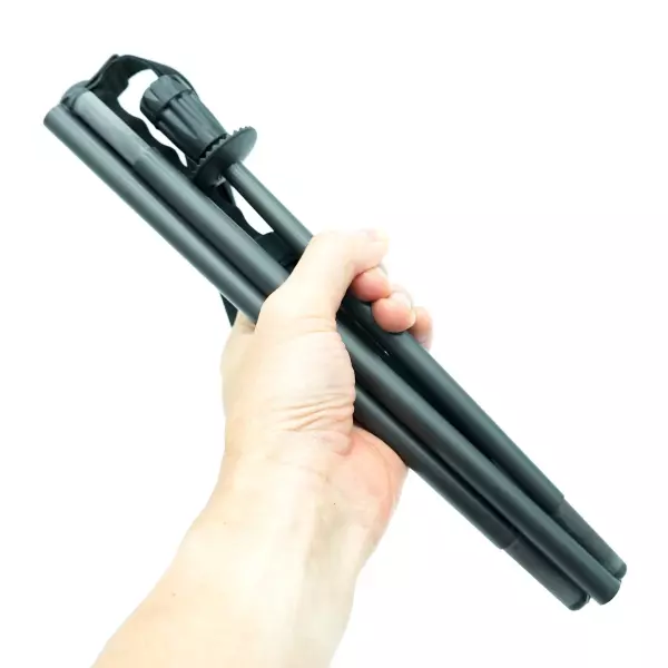 軽量で仕舞寸法が短いので、ザックに取り付けられたポールのコードに固定させやすく、ザックにコードがなければ、ダイニーマ製ショルダーポケットに収納させることができるので、岩場や鎖場が多い山道ですごく便利です。