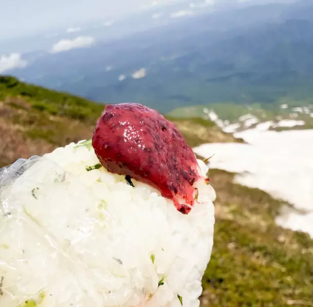 紫蘇が入ることで、華やかな香りと、紫蘇による殺菌作用で保存性を高め、解熱効果があるらしく登山でとても良い食品だと考えています。