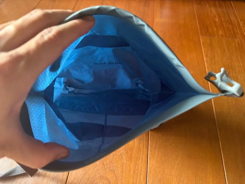 なので内側には緩衝性のある3Dメッシュ素材がライニングされていたのですが、僕の場合は必要がないのでカットしてしまいました。ドライバッグのような使い方ができて、それを肩掛けして持ち歩けるアイテムというのはなかなかなく、濡らしたくないものを持ち歩くのに便利だと思います。