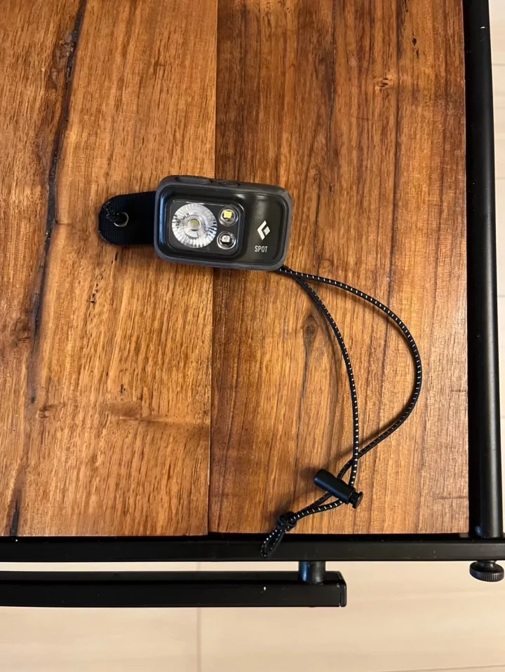 夜間散策や設営に使用するヘッドライト。海でも山でも必ず必要となる装備の一つである。防水性能が高く、海の環境でも安心して使用できる。