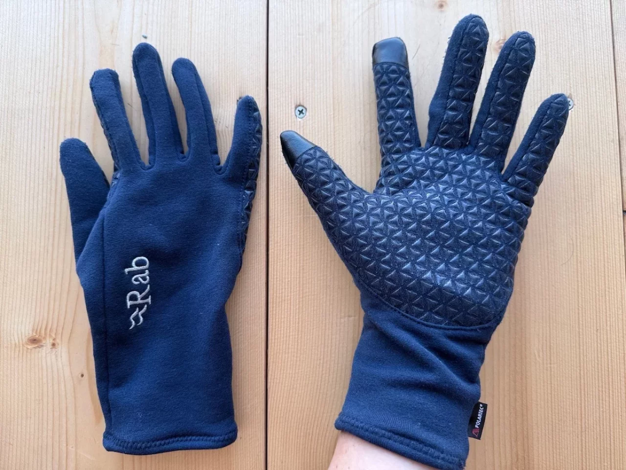 登山開始から稜線に出るまでの登山では真夏に使用するトレッキンググローブで十分なのですが、稜線に出ると常に寒いことが予想される場合はRabのパワーストレッチコンタクトグリップグローブを愛用しています。