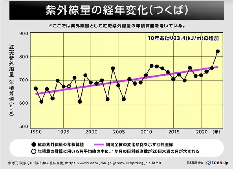 気象庁の観測によると1990年以降、日本国内の紫外線量は長期的に増加しており増加率は10年あたり約4.6%とされています。特に春〜夏にかけての紫外線量は非常に高くなっています。
