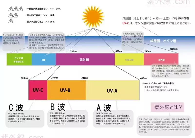 太陽からの日射は波長により分けられ、可視光線よりも波長の短いものが紫外線です。その紫外線(UV)の中でも波長の長い方からA・B・Cと大別されます。