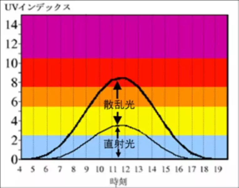 実際、直射光よりも散乱光のほうがUVインデックス(人体に及ぼす影響の度合い)は高いことがわかります。
