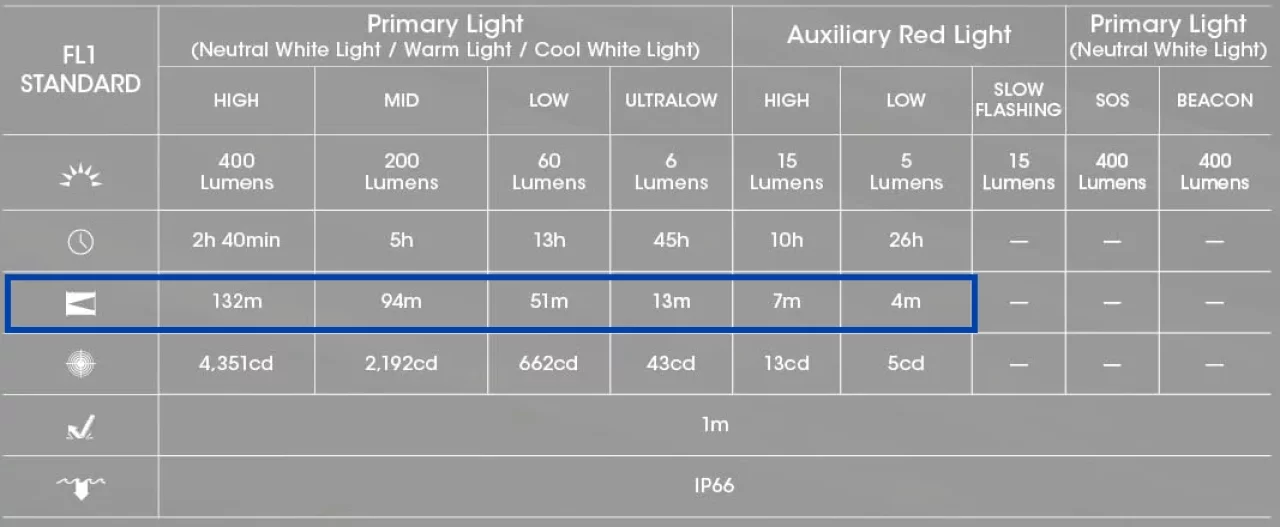 表を見るとわかりますが、カンデラ(cd)は光源から特定方向への光の強さ(光度)を表す単位ですか、もっとも明るい400lmで132mまで明かりが届きます。月明かりが届かない暗闇では400ルーメンを使用し、そうでない場合は200ルーメンで十分です。