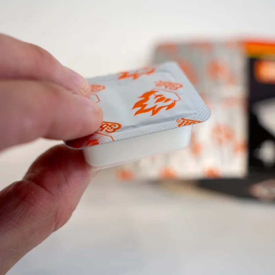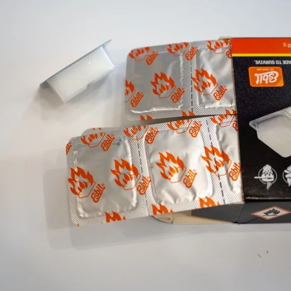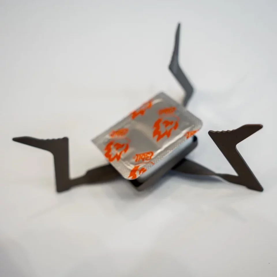 固形燃料は標高が高くなっても燃焼力が落ちづらいEsbitのスタンダードを使っています。これはブリスターバックと呼ばれるパッケージの中に固形燃料が入っているので濡れないこと、僕が使っているEsbitの固形燃料ミリタリー1つが14gで、このタブレット1つで約12分燃焼します。風がない場所で500mlのお湯が約7分30秒で沸騰します。実際に山で使用すると約10分でお湯が沸く印象です。