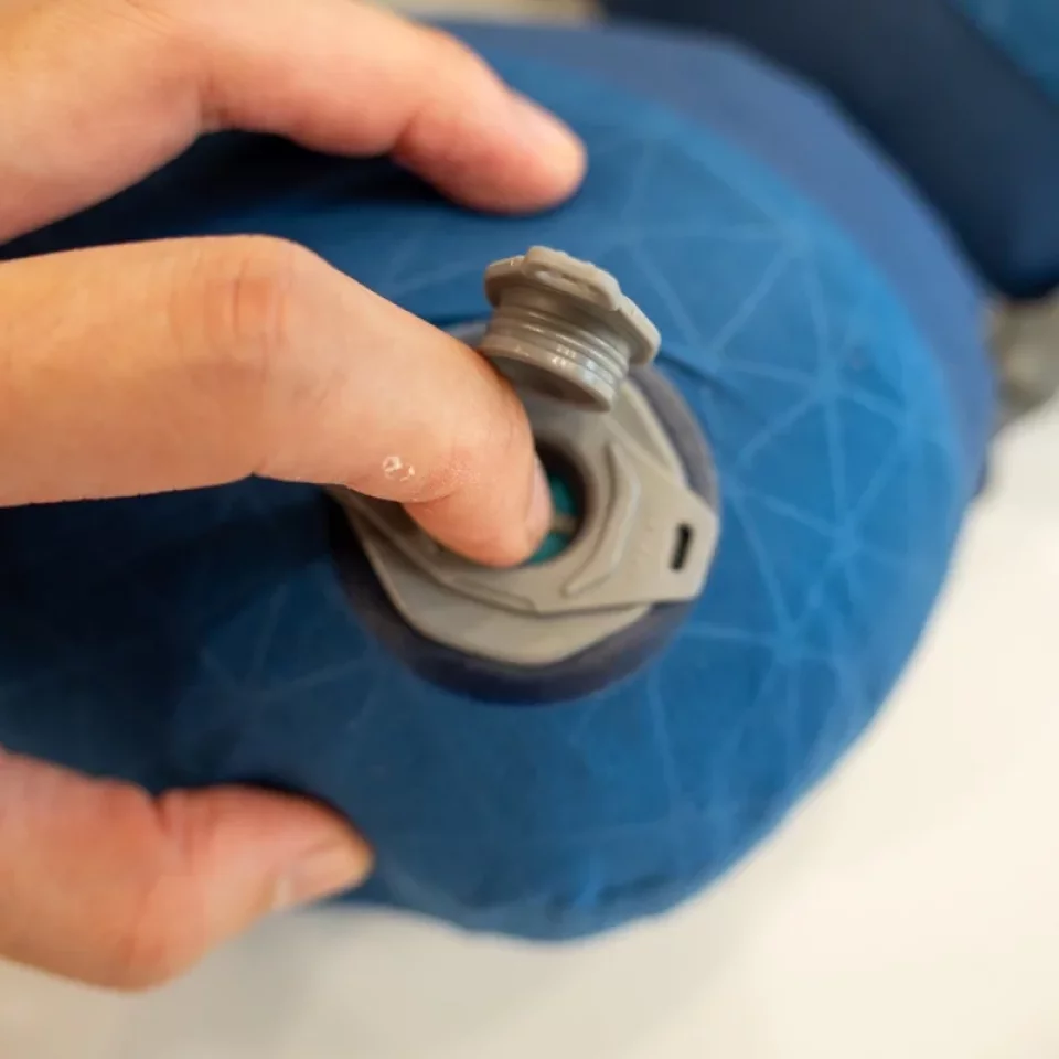 素材は非常にソフトな肌触りのポリエステルストレッチニットで、使っていても音が全然しない気持ち良い肌触りです。空気を入れる場所には2段階のバルブが備わっており、空気を入れている最中に空気が抜けることがありません。さらにパンパンに空気を入れた後ミニバルブを使って細かく排気ができて枕の硬さや高さを微調整することができます。