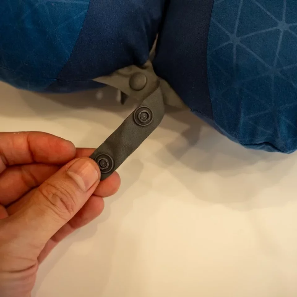 空気を入れた後首にフィットさせ、首の前でスナップボタンを止めればしっかりと首にフィットさせた状態で気持ちよく就寝ができます。このスナップボタンは3段階で調整することができるので、子供から大人の女性、男性まで活用することができます。登山用の枕としても活用することができ、遠征登山や高速バスを活用しての登山でとても便利です。