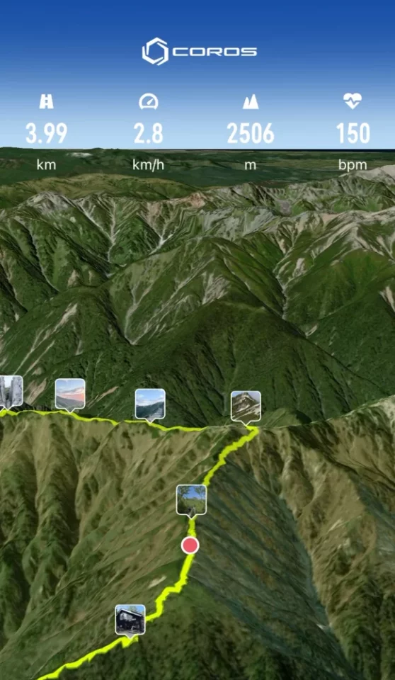 山を登り終わった後は、COROSのアプリを使って山の思い出を共有することができます。登山中に撮影した写真は位置情報も含んでおり、GPSトラックに後から追加することができます。