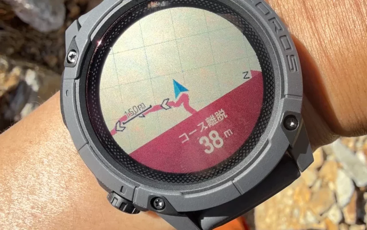 コース開始ボタンを押す前に「離脱アラート」をオンにすると、ルートから外れた時に時計がアラートを出してくれます。これによって道迷いの心配がなくなり、さらにコースが外れたタイミングでアラートを出してくれるので、大きく間違ってまた戻らなければいけないというタイムロスがなくなります。
