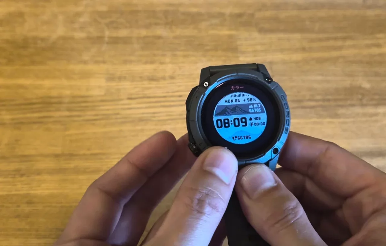 そして非常にシンプルなインターフェースで、扱いやすいのも特徴です。右下にあるダイヤルではないボタンを長押しするとメニューが出てきます。中には心拍数の確認、オキシメーターと言って、身体が高地の標高にどれぐらい適応しているかを知るために血中酸素飽和度SpO2の測定、ウォッチフェイスの変更、時計のインターフェースの設定やボタンの設定などが可能です。