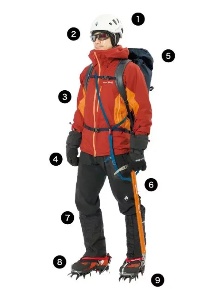 冬の雪山登山では、適切な服装に加えて専用の装備が必要です。上図は、本格的な雪山登山用の装備で、帽子+ヘルメット、ゴーグルやサングラス、レイヤリングしたグローブ、ピッケル、ゲイター、雪山用登山靴とアイゼンなどが要ります。
