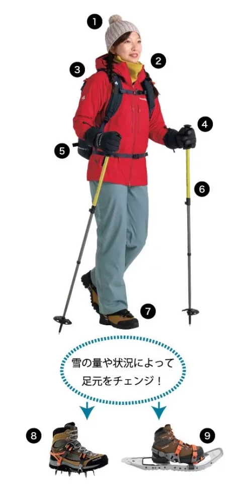 積雪した低山歩きを楽しむスノーハイクなら、防寒を重視した服装と、普段の登山靴に装着できる軽アイゼン+トレッキングポールがあれば楽しめます。下図はスノーハイクやスノーシュー向けの装備です。