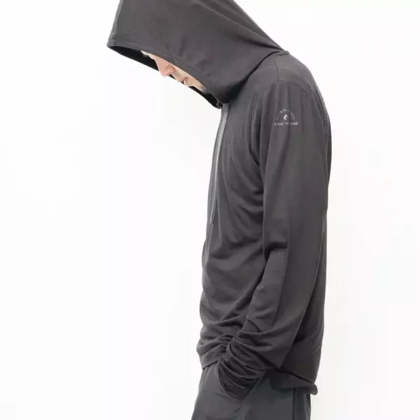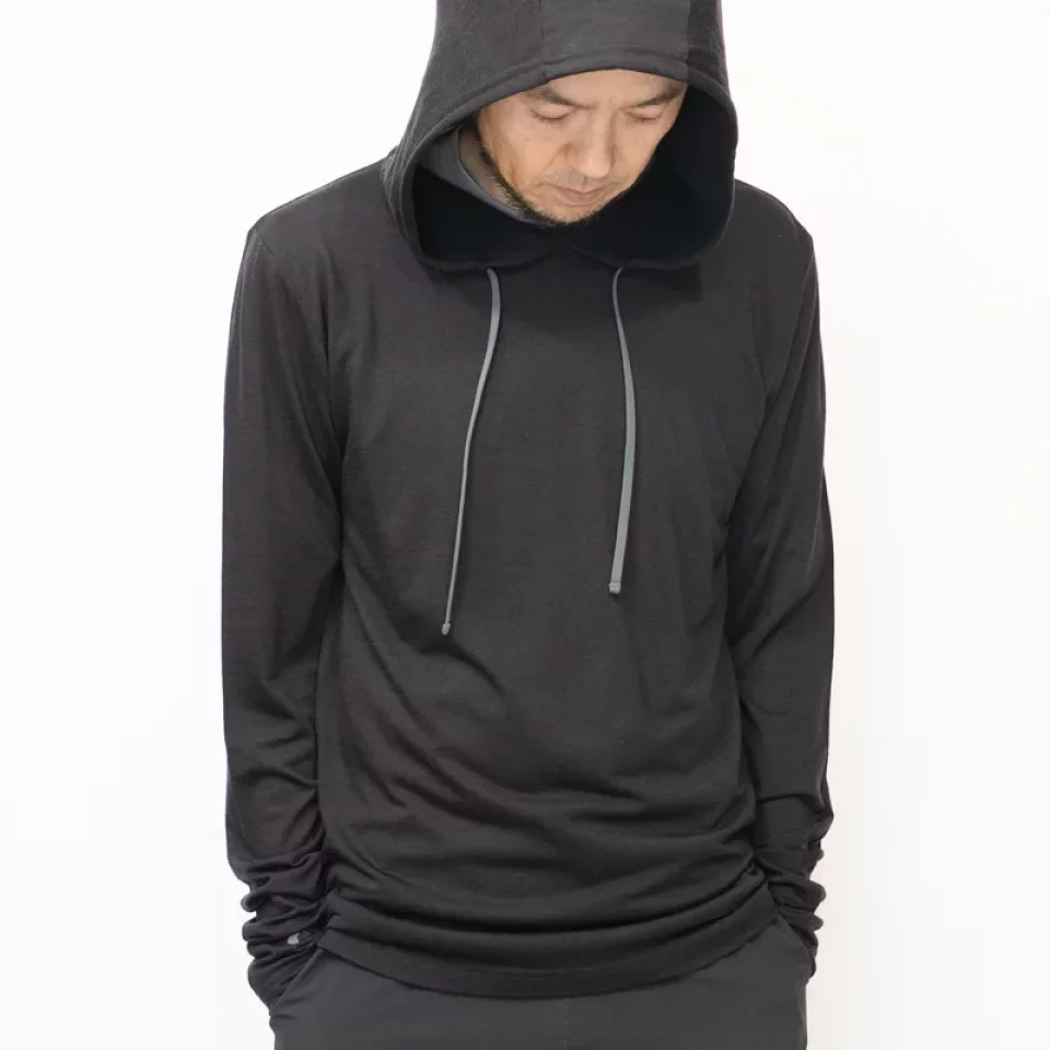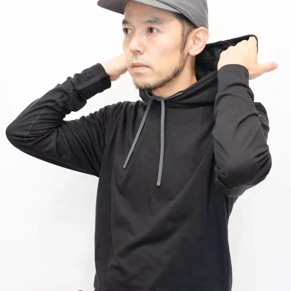 このフーディーは、天然メリノウール(87%)+ナイロン13% という混紡素材で作られており、軽量でありながら通気性に優れています。特に夏や強い陽射しの下でのアクティビティに向けて設計されており、UPF35の紫外線防止性能を持っているため、屋外での長時間行動でも肌へのダメージを抑えることができます。また、メリノウールならではの適度な保温性により、登山中の急な冷え込みや風を受けた際にも心強い防寒・防風レイヤーとして機能します。