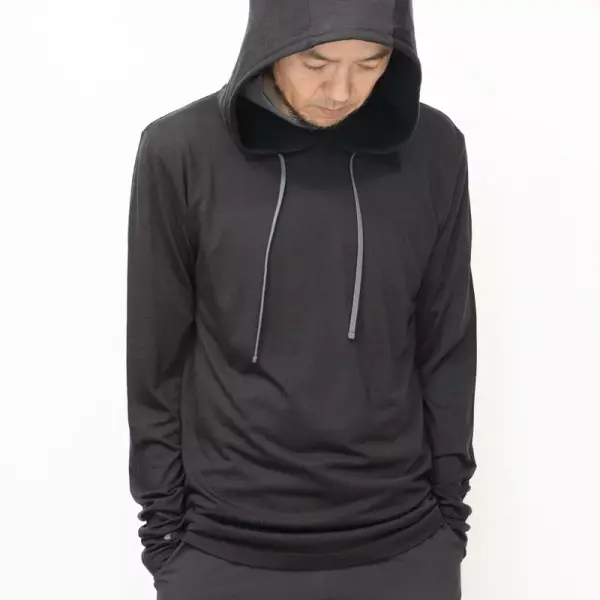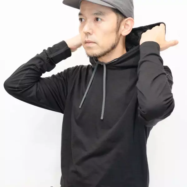 「軽い」「滑らか」「呼吸するような素材感」。これらがこのフーディを着て最初に感じるポイントです。
