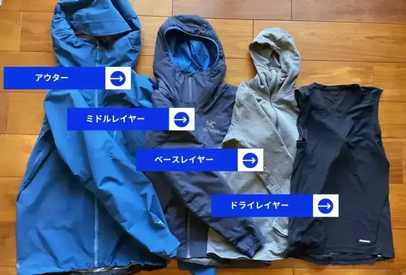 基本は上図のように、「ベースレイヤー」「ミドルレイヤー」「アウターレイヤー」の3層構造ですが、近年はベースレイヤーの下に「ドライレイヤー」を着用した4層構造が支持されています。