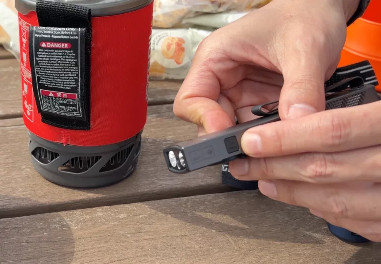 登山シーンにおいてはシュラフから出てトイレに行くときのハンドライトとして、ストラップに取り付けてヘッドライトとして、また地面に置いて食事をしたり片付けたりするのに便利です。