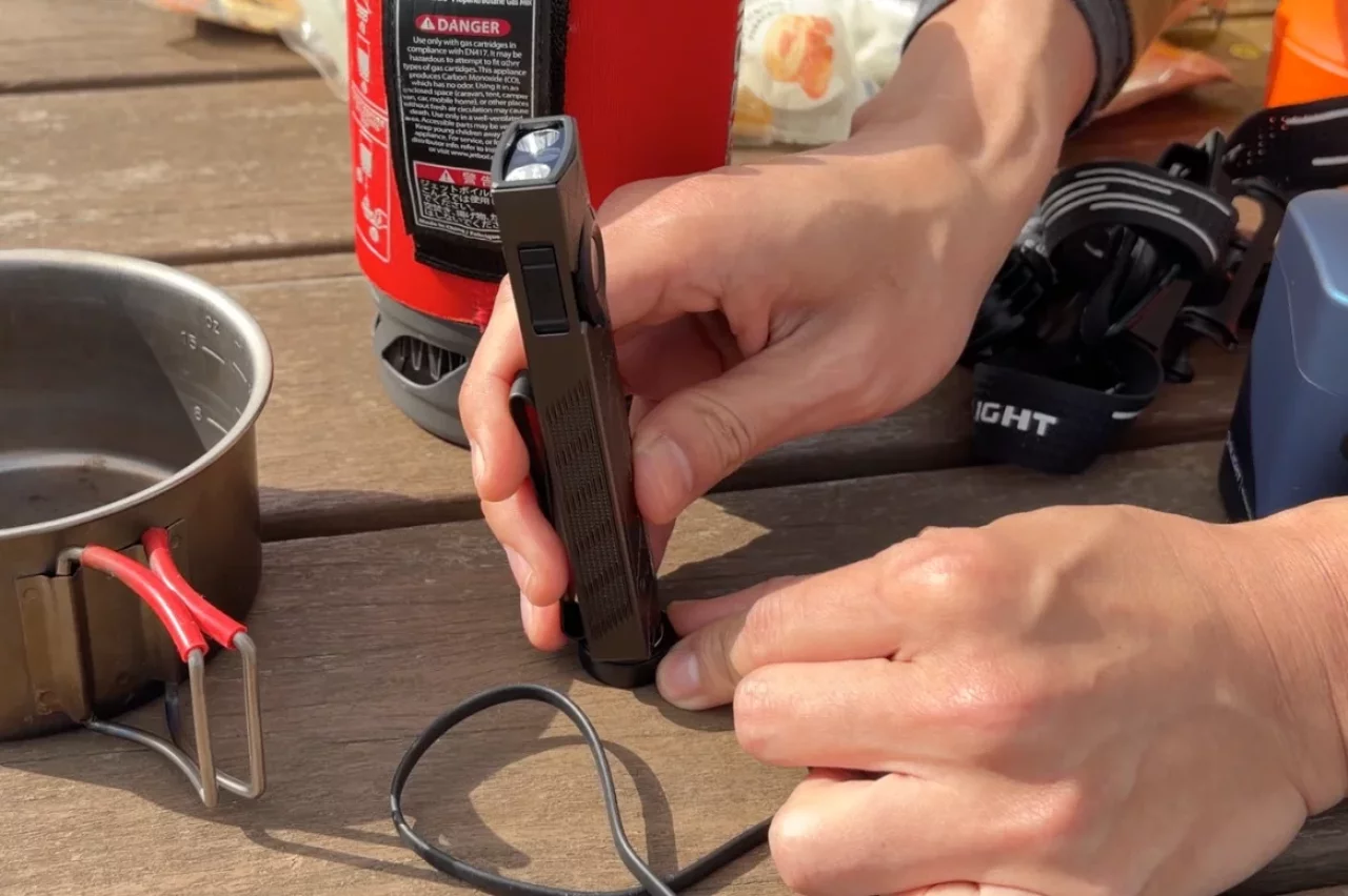 充電面でも優れています。磁気マグネット式の充電ポートを備え、USB-Aの電源から手軽に充電可能。急場に備えておく"ライト+電源"という備蓄の考え方にもフィットします。ボディはアルミニウム合金製、強固な造りでありながら重量は150 g前後と装着時の負担も抑えられています。防水・防塵性能もIPX8を確保しており、雨や雪、濃霧などアウトドア環境でも信頼できます。