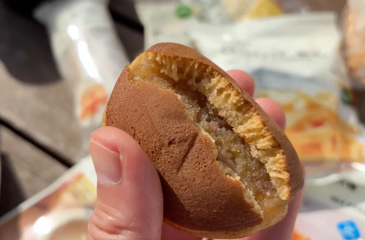 八つ目は「紅はるかの芋どら焼き」。ふんわりとした生地の中に、紅はるかのペーストがたっぷり入った一口サイズのどら焼きです。しっとりとした食感と自然な甘さが特徴で、登山中に疲れた体にやさしく染み渡ります。糖質がしっかり取れるため、行動中のエネルギー補給に最適。しかも、どら焼きながら個包装で持ち運びしやすく、ザックの中でつぶれにくいのがポイントです。