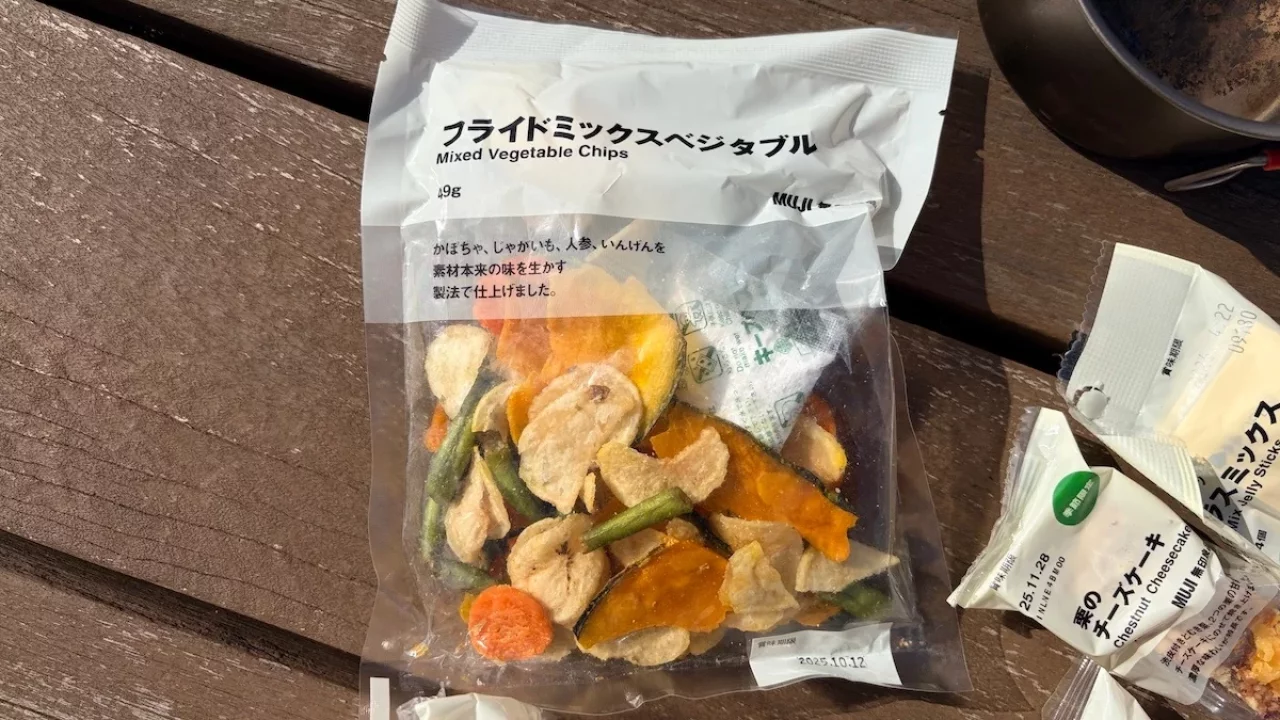 七つ目は「フライドミックスベジタブル」。かぼちゃ、にんじん、ジャガイモ、いんげんなどの野菜をサクサクの食感に仕上げたスナックです。軽くてかさばらず、行動食の合間に"野菜の甘み"を感じられるのが魅力。脂っこさが少なく、登山中でも食べやすいのが特徴です。見た目にも彩りがあり、気分を上げてくれるのも嬉しいポイント。栄養バランスを意識したい方にもおすすめで、塩味が控えめなため、甘い系の行動食との組み合わせも良好です。ポテトチップスのようなスナック感覚で、手軽に野菜を摂れるのはうれしいですよね。山頂でコーヒーやお茶と一緒に食べれば、ちょっとしたピクニック気分に。登山の合間に気分をほぐしてくれる、やさしい味わいのスナックです。