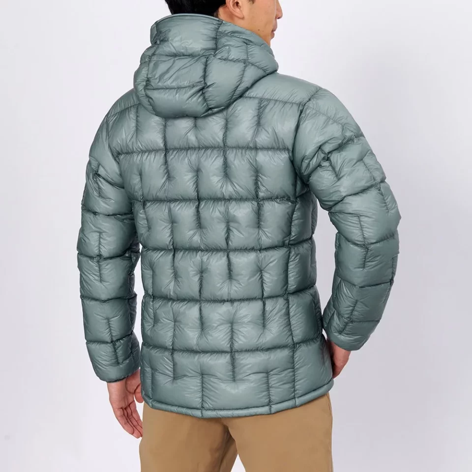 一般的な軽量ダウンの多くは、袖口や裾にドローコード、フードにアジャスターを備えていますが、このモデルではそれらを一切排除。その潔さが、圧倒的な軽量化に直結しています。