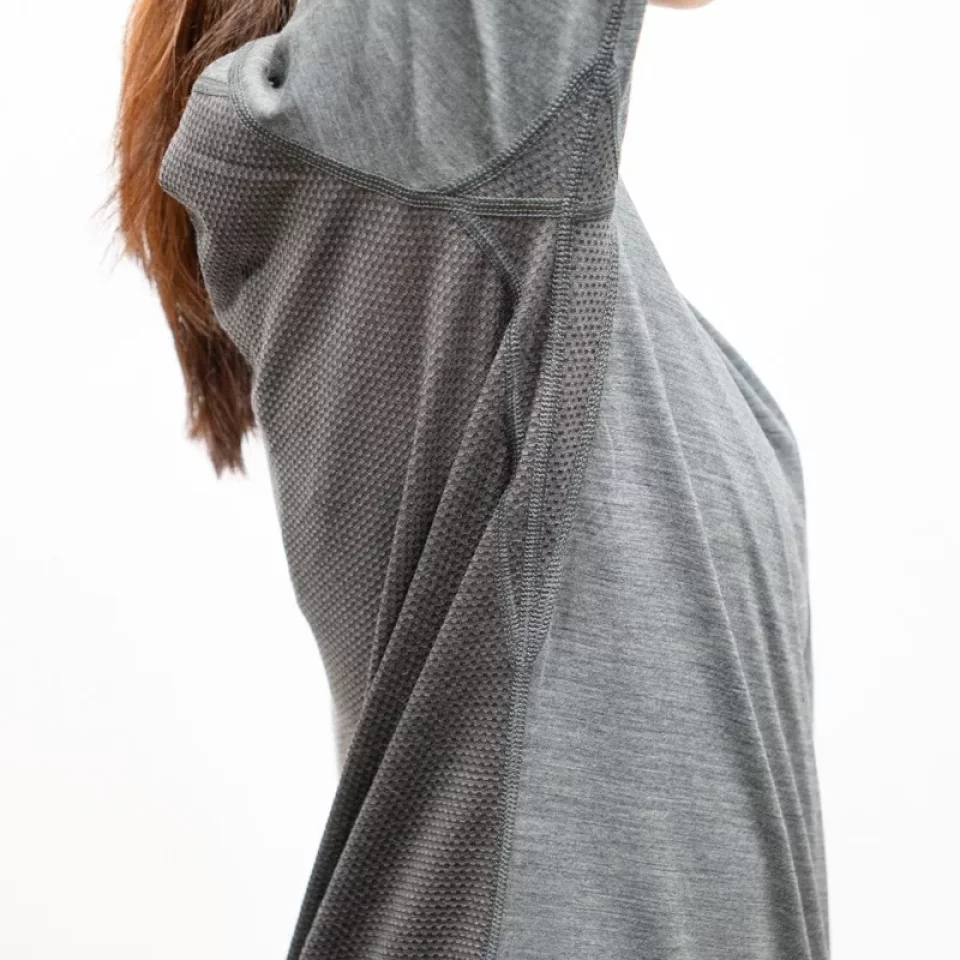 山旅のバックメッシュはメリノウール50%、ポリエステル50%の速乾メリノウールをベースに、背中全体と脇部分にはより乾きの早いメリノウール50%、ポリエステル47%、ポリウレタン3%のメッシュを備え、発汗量の多いアクティビティで快適性を維持し続けるベースレイヤーです。