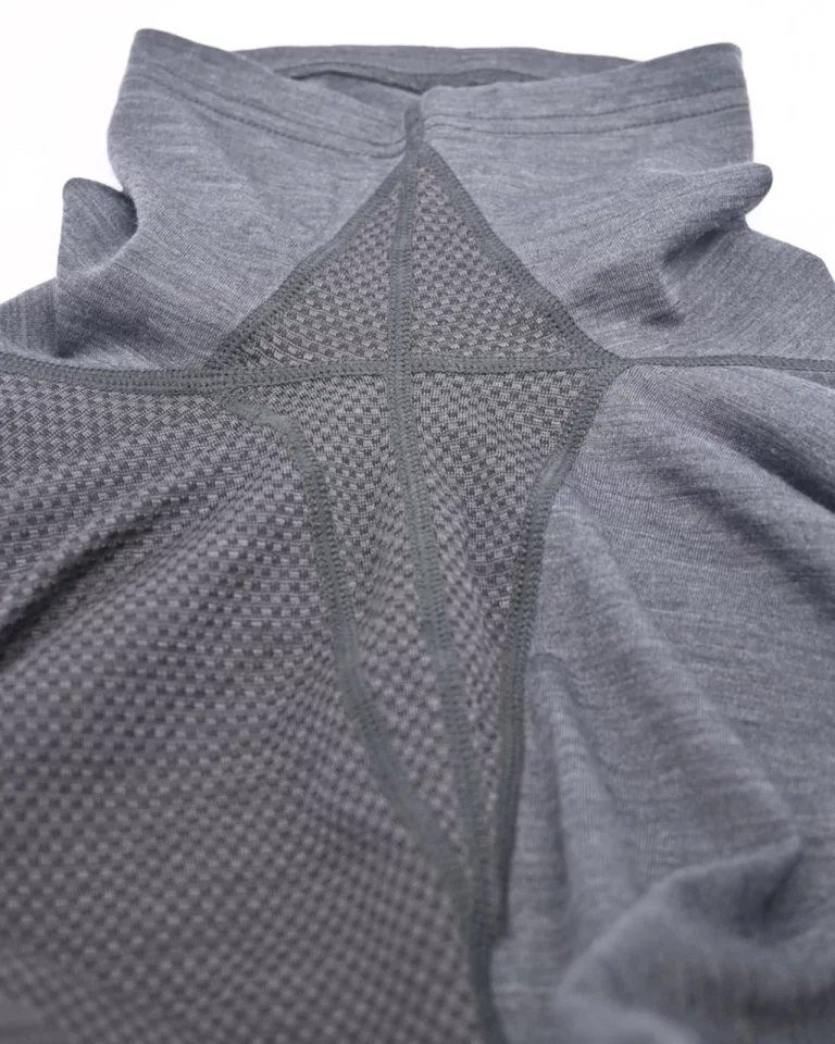 こちらも実物を見に来られる方が多かったウェアです。このTシャツの最大の特徴は、メリノウール50%、ポリエステル47%、ポリウレタン3%の混紡素材である事。背中のメッシュ生地も同素材が使用されており肌を常にドライに保ち続ける機能を備えています。登山中に汗のコントロールが難しい!と感じている方、縦走登山でベースレイヤーの匂いが気になる方!必見のウェアになっております。