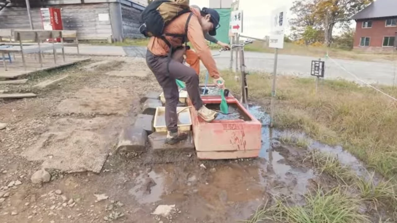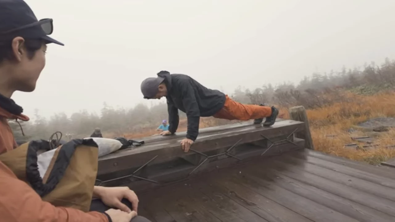 今回同行した山旅旅・柳原さんの朝のルーティンを伝授される私。