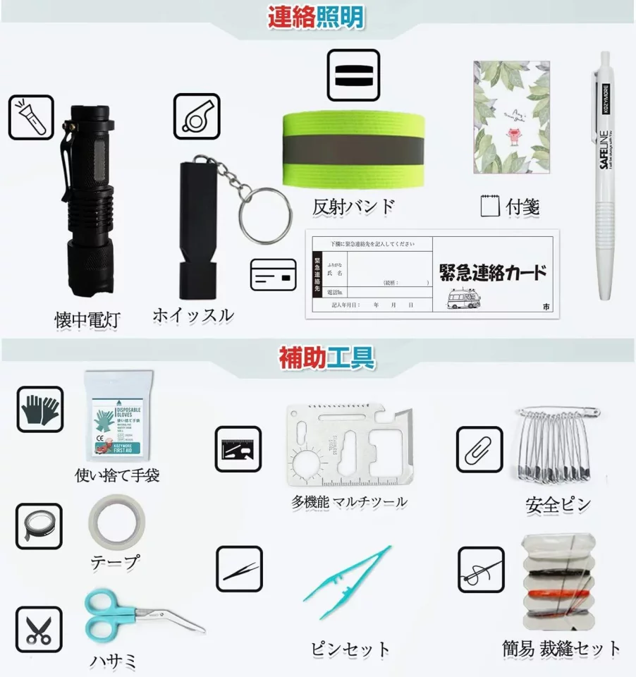 懐中電灯、笛、反射バンド、使い捨て手袋、多機能マルチツール、付箋、ポイズンリムーバー、はさみ、安全ピン、ピンセット、簡易裁縫セット、テープ、止血帯、眼帯、包帯、三角巾、簡易トイレ、人工呼吸用携帯マスク、サバイバルシートなど外傷手当用品のほか、非常時にも役立つ28種113点のアイテムが入っています。
