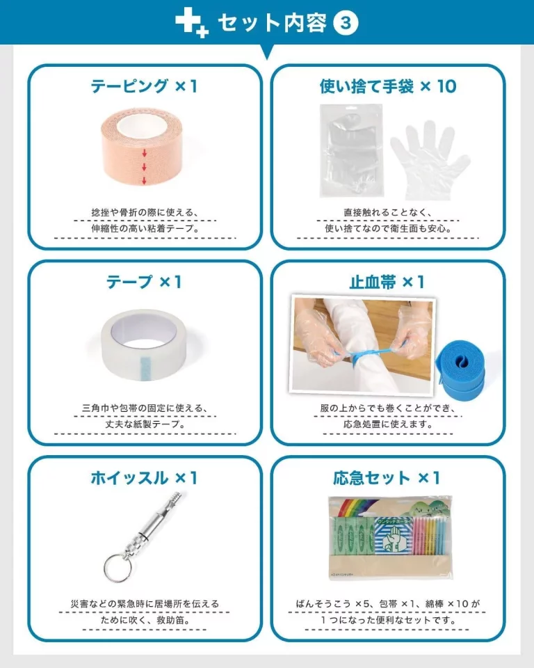 包帯、絆創膏、綿棒の応急セットのほか、ドライバーや缶切り、ナイフがセットになった多機能カード、止血帯、ガーゼ、テーピングテープ、サージカルテープ、使い捨て手袋、三角巾、ピンセット、はさみ、笛、ポイズンリムーバー、エマージェンシーシートなど16種類21点が入っています。