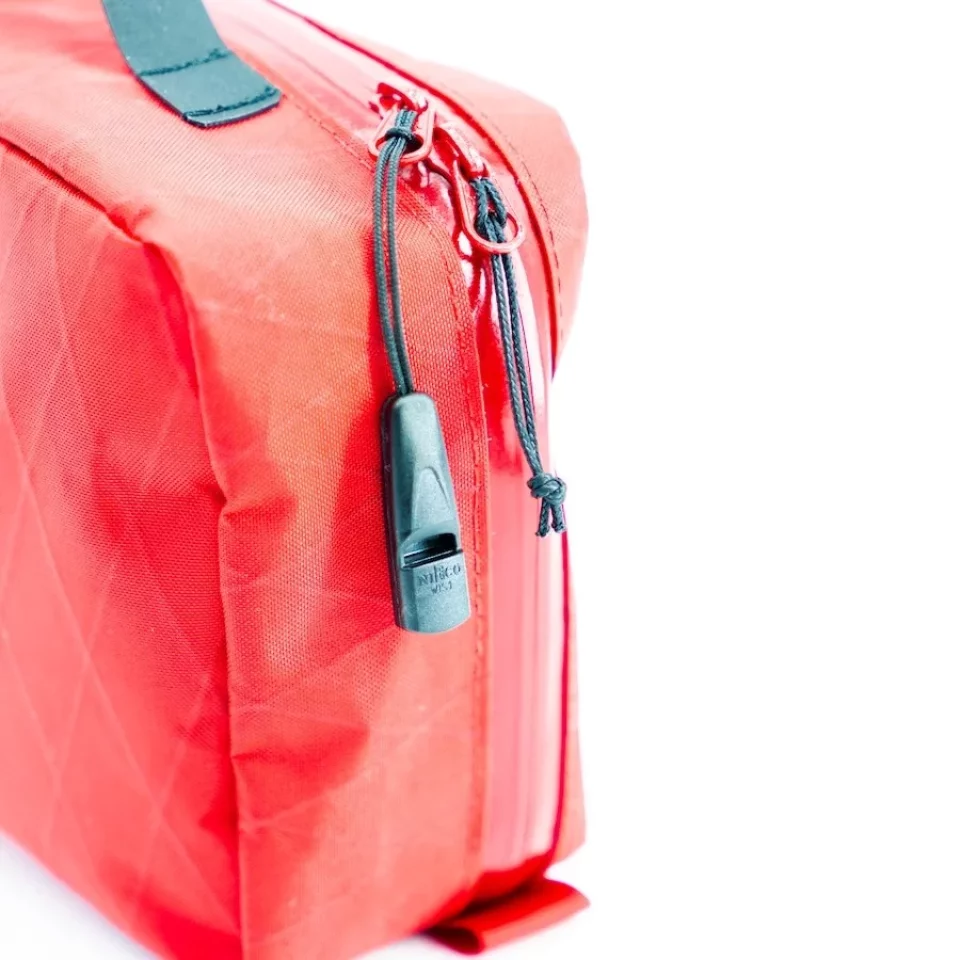 外側にX-PAC製の白十字型のポケットを配置し、最も使用頻度の高い絆創膏を収納できます。デザイン性と利便性を両立した作りで、ジッパーの引き手にはホイッスルが付き、助けを呼ぶことができます。