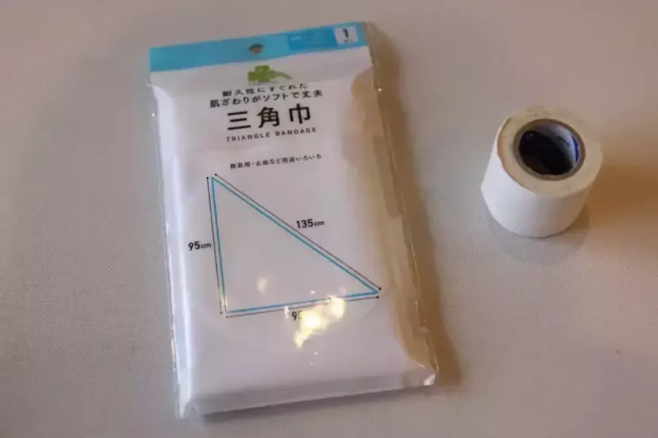 三角巾は、腕を吊ったり、捻挫を固定したり、外傷の止血の当て布として使ったり、保冷剤や添え木を固定したりと、さまざまな用途に使えます。2枚あると安心です。