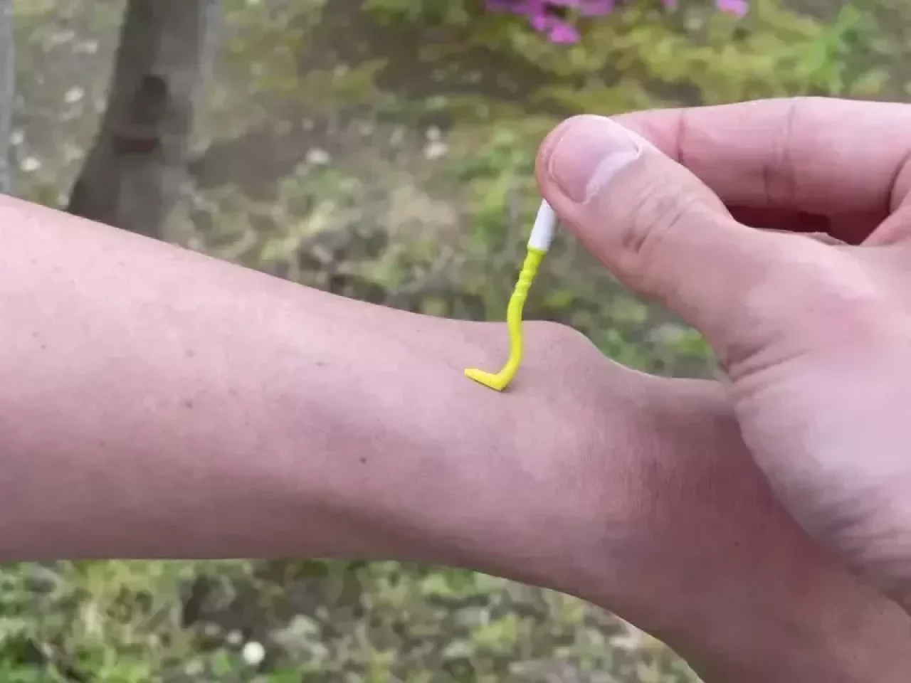 マダニが肌を刺しているのを見つけたら、マダニと肌の間にティックツイスターを差し込み、ねじりながら引いていくと、体内にマダニの一部を残すことなく除去できます。