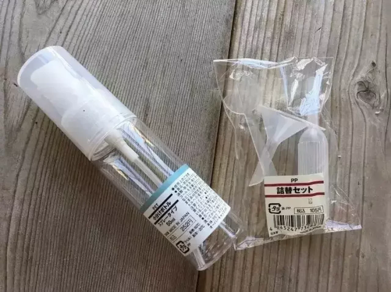 出来上がった虫よけスプレーは大きめの瓶などに保存し、無印良品の「詰替えセット」を使って「小分けボトルスプレータイプ」に移し替え、持参するといいでしょう。