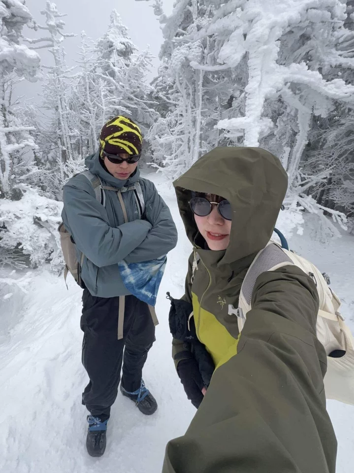 ということで、意図的に景色の話を出すようにしたが、今日はあいにく曇っていて景色は何も見えない。見えるのは手前の木々にできた氷柱たちだ。雪山は手前の景色だけでも十分楽しいから本当にいい。