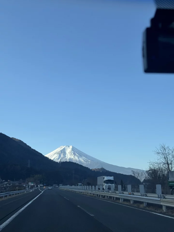 晴天予報の曇りなき空に聳える富士山。喜んでいたら後部座席からおつきみちゃんが「富士山が見える時って絶対にトラックが一緒にいるんですよね」と言ってきた。