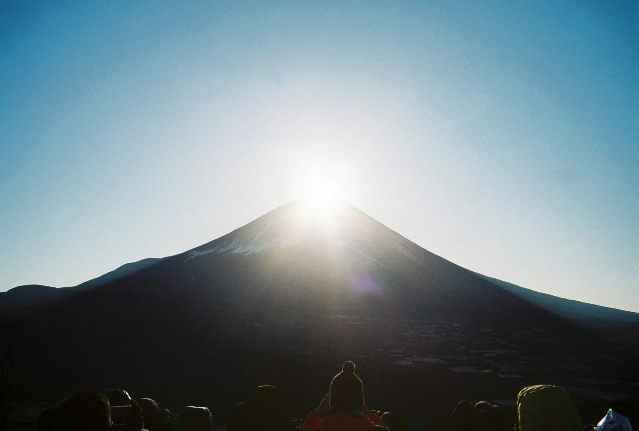 ずっと見えていた富士山を改めて山頂から見上げる。ここから見える富士山は嘘みたいに2Dだ。銭湯の壁紙のよう。
