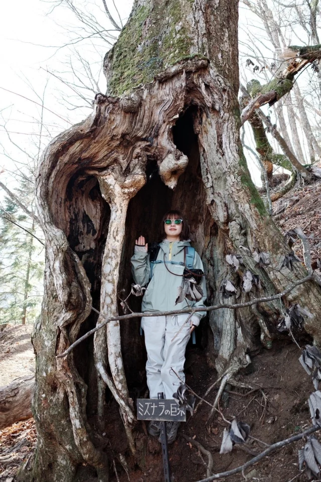 登山口からすぐのところに、人が1人入れそうな巨木があったので、おつきみちゃんを奉納した。想像通り、ちょうどいいサイズで収まっている。
