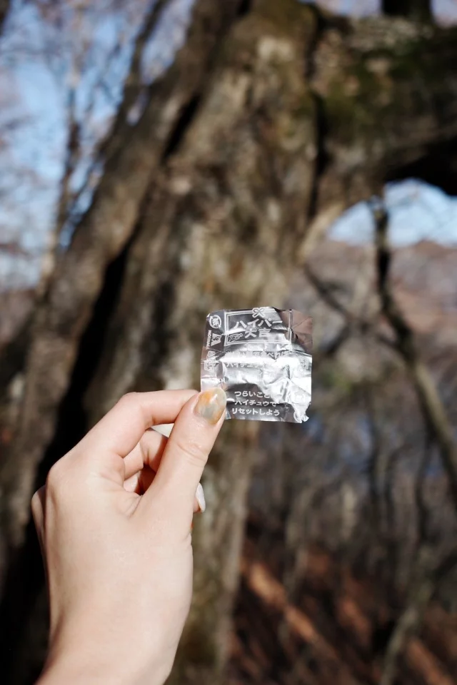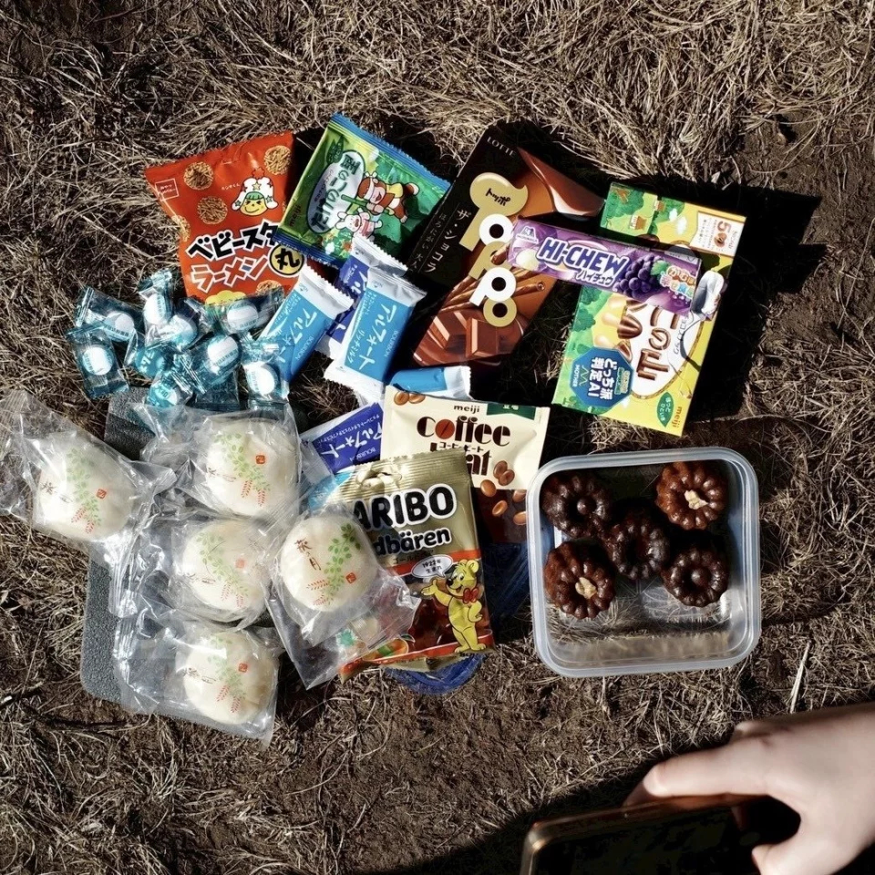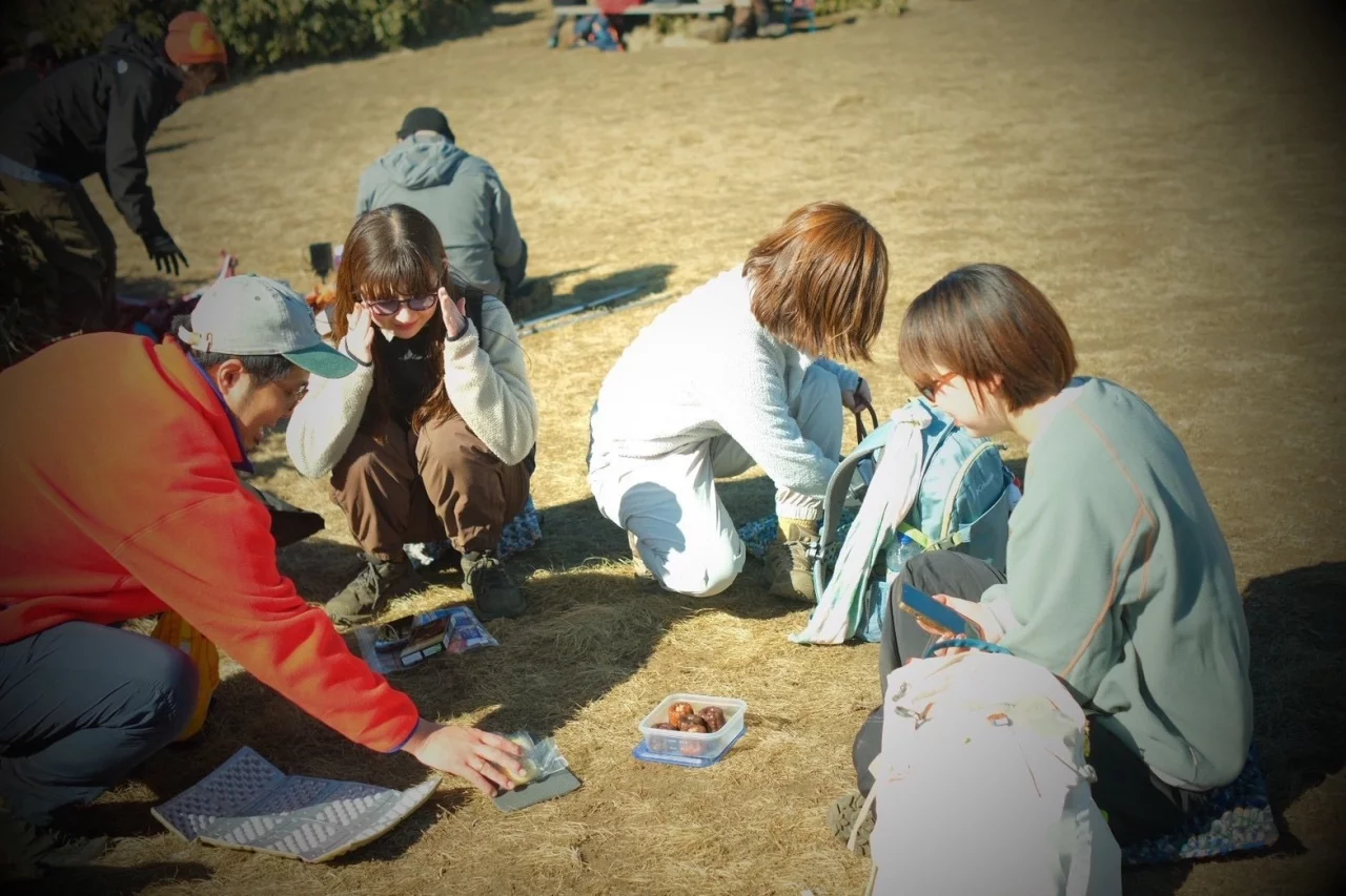 風が冷たいのではないかと怖がっていた山頂は、嬉しい想定外でポカポカとあたたかかった。「これは流石にお茶をしよう!」とみんなでありったけのおやつを並べて腰をかける。