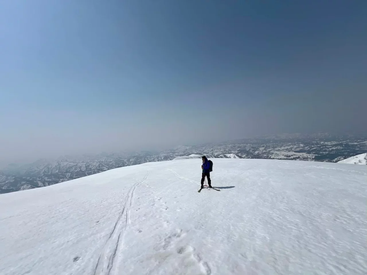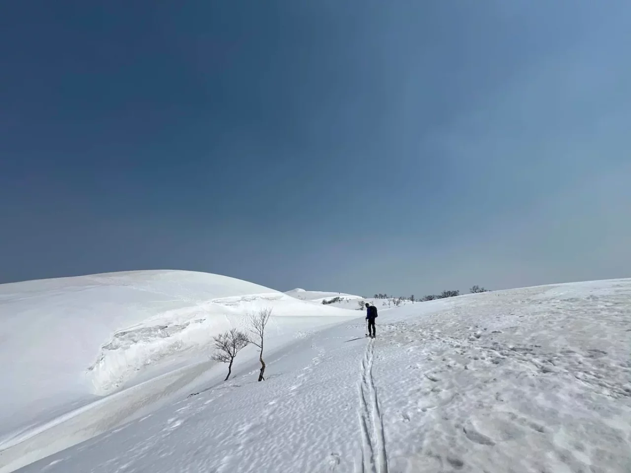春の守門岳の旅は旧大原スキー場から始まる。今はなきスキー場のゲレンデをのんびりとハイクアップしていくとやがて尾根が細く急になる。これをキックターンでこなせば、サッカー場くらいはできそうな広大な雪原に出る。更に平坦地を進めば右手が東洋一の雪庇だが、どこから雪庇が始まるのかこの場所からは察することができないので容易には近づけない。
