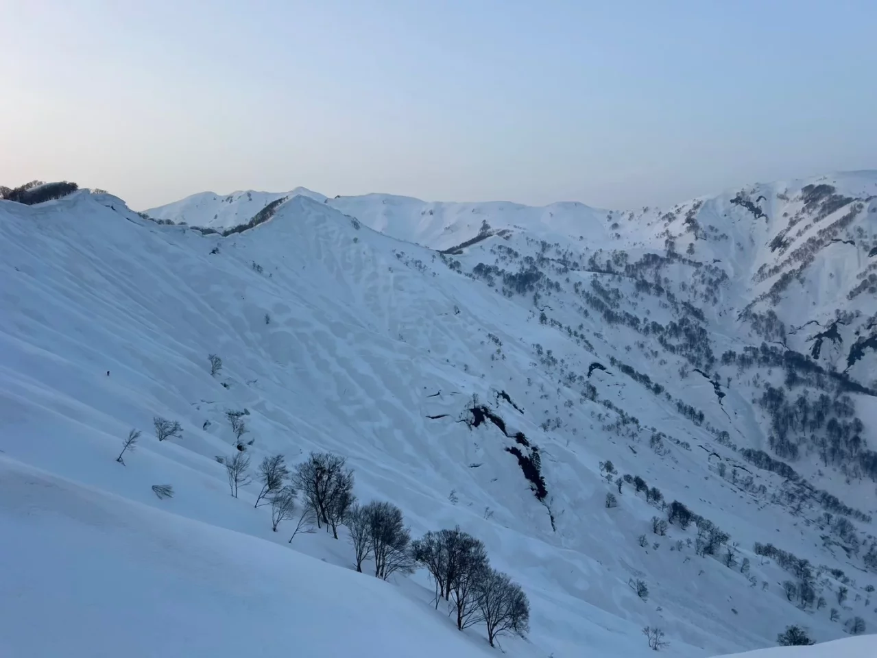 これらの滑降を心ゆくまで楽しんだら、下山はルート取りをよく考えながら下黒姫沢を選択するのがいい。元気があれば1177mピークまで尾根筋を南下するのもいい。この尾根は途中で痩せてシートラを余儀なくされるが、1177mピークはその努力が報われるような美しい東斜面を隠し持っている。