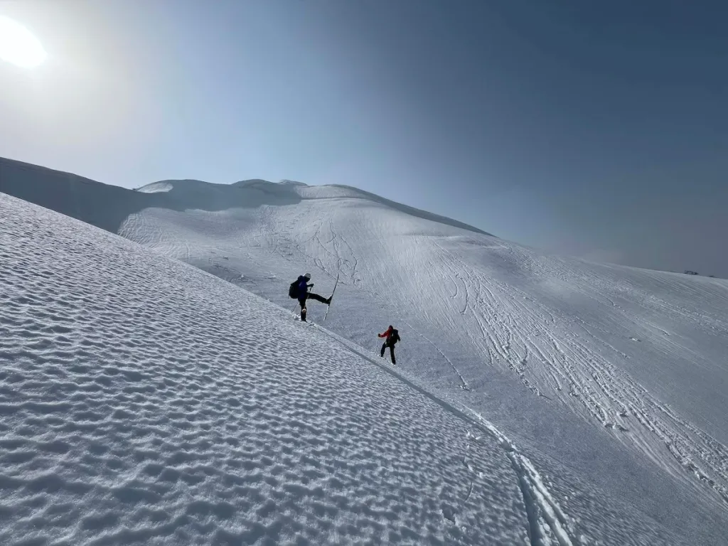 ここから大きく東へトラバースして袴腰の北東尾根に乗る。袴腰を目指して途中からシートラに切り替え、山頂に立ったら越し方を見て、大雪庇をよく眺めるといい。