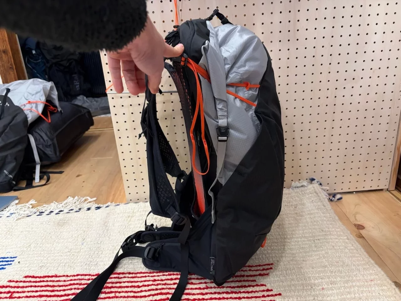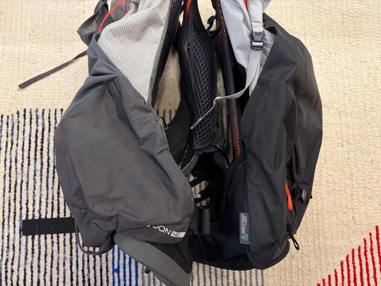 このクラスの軽量ザックの多くはフレームレスモデルを採用していますが、Rabのサイクロン XP 40は、湾曲したフレームが背面に「ロの字型」に配置されています。